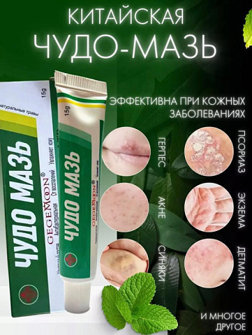 Китайская чудо мазь показания к применению: псориаз, экзема, дерматиты, акне, герпес, укусы насекомых, синяки, ожоги, порезы, ссади. Помогает снимать аллергию на коже. Негормональный крем не лечебный восстанавливающий подходит для взрослых и подростков, для малышей мальчиков и девочек нельзя. Способ применения: слегка массируя, нанесите крем тонким слоем на чистые проблемные участки 2-3 раза в день. При применении возможно ощущение прохлады или тепла, которое проходит в течение нескольких минут. Не подходит под кожу вокруг глаз. Без агрессивных компонентов. Применение минимум 14 дней. Максимального срока применения не существует, можно применять постоянно при необходимости. Крем не вызывает привыкания, не содержит в составе гормоны. Перед первым применением проверить на аллергическую реакцию на небольшом участке кожи. Крем желтого цвета, наносить необходимо тонким слоем (1 горошины хватит для нанесения на обе ладошки). При нанесении на лицо может пощипывать глаза (данный эффект проходит в течение 2-3 минут). При небольших дефектах кожи чудо мазь можно смешивать со своими уходовыми кремами. Противопоказания: беременность и период лактации, детский возраст, индивидуальная непереносимость компонентов. Не применять на открытые раны, избегать попадания в глаза, в случае попадания тщательно промыть водой.