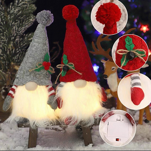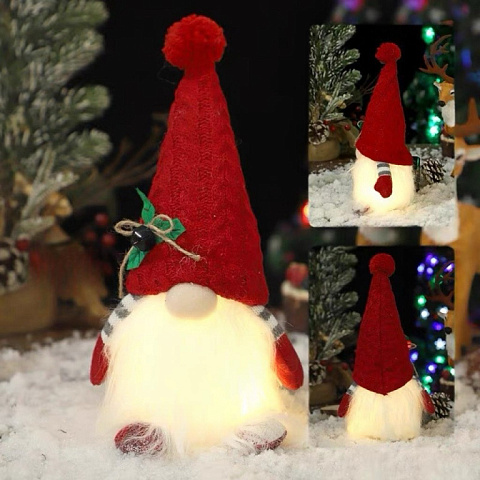 Игрушка оснащена встроенным светильником с мягким, ненавязчивым светом, который создаёт уютное освещение и наполняет комнату праздничным настроением. Высота 28 см делает гнома удобным для размещения на полке, подоконнике или праздничном столе.