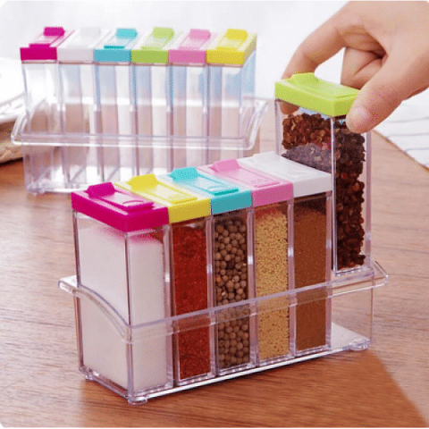 Набор для специй Seasoning Six Piece Set состоит из 6 емкостей с разным цветом крышек для удобства хранения различных приправ, каждая емкость под отдельную приправу. У каждого контейнера 2 вида выходных отверстий: 3 маленьких отверстия для порошковой приправы, 3 больших отверстия для больших частиц приправы. Баночки легко открываются и легко закрываются, очень удобны для ежедневного использования. Прозрачный корпус банок позволит легко различать приправы.